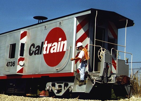 The Assistant Conductor of this Caltrain work train chats with his boss about where to go for beans. Dan Klitzing photo.